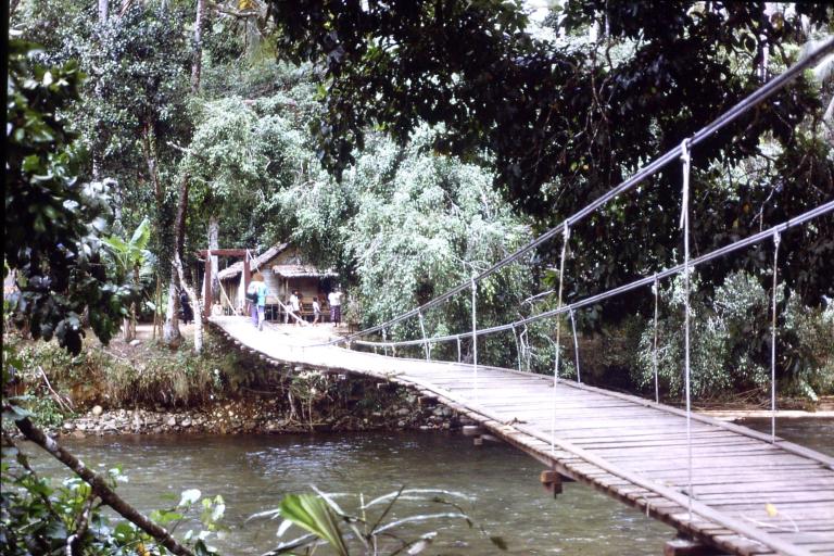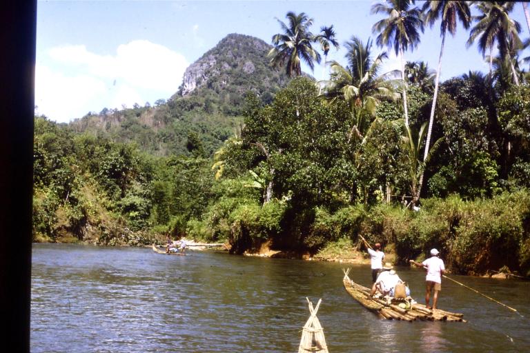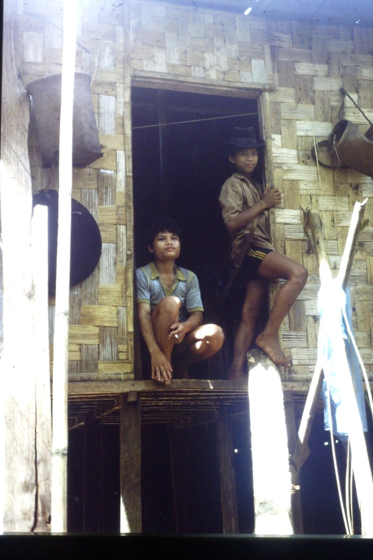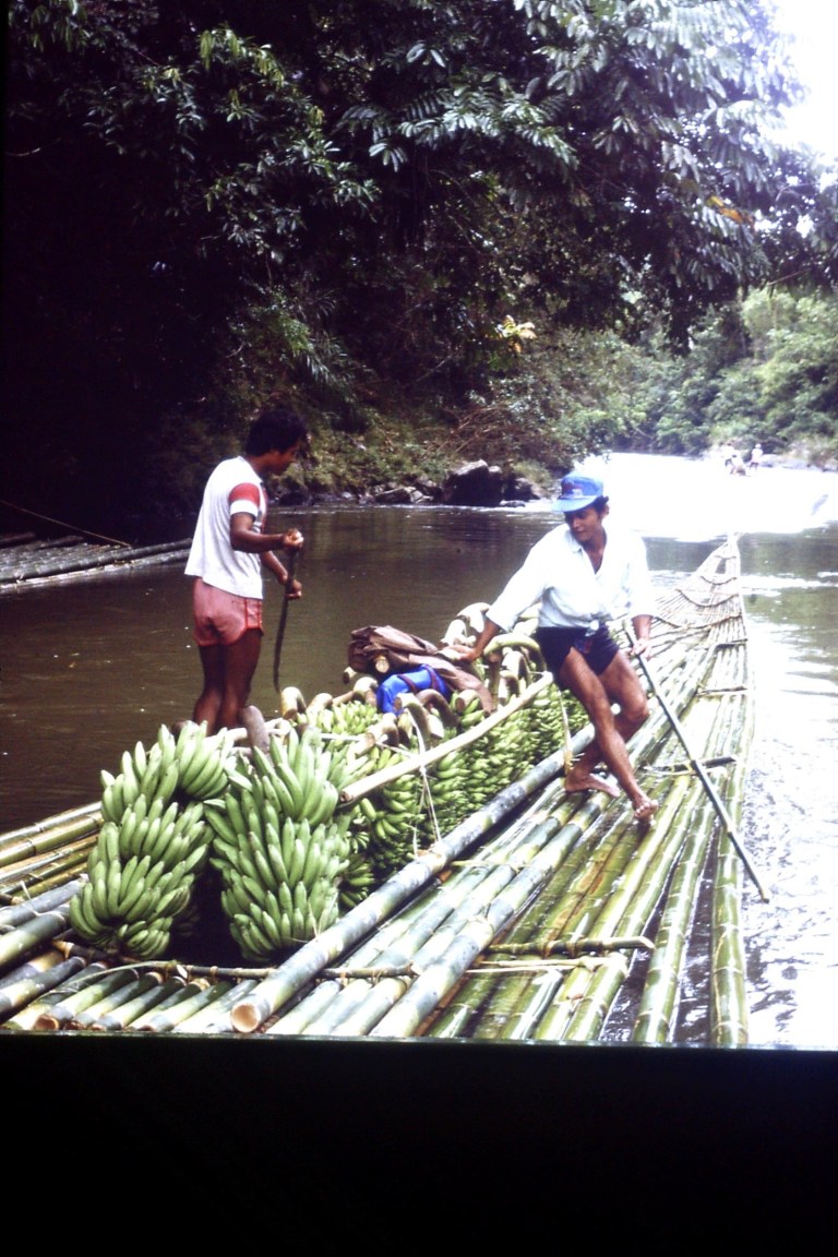 Our journey took us by jeep along tracks of deep mud, by bamboo raft with people transporting bananas to market, and we encountered Dayak tribal people living in their longhouses, 20 to 30 families living together. We walked through thick jungle, either crossing rivers by bamboo bridges or wading through them. Paths turned to mud flow in torrential tropical storms. At night we often would stay at the Village Headman’s house as this is customary.