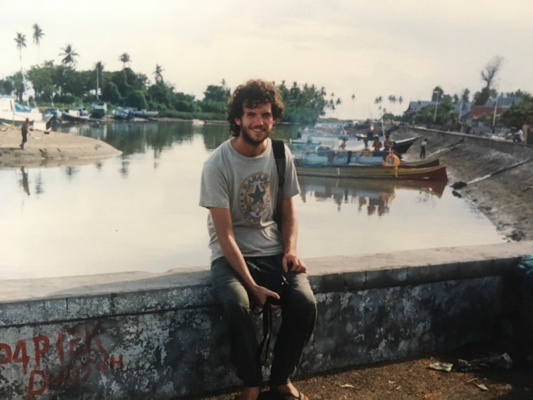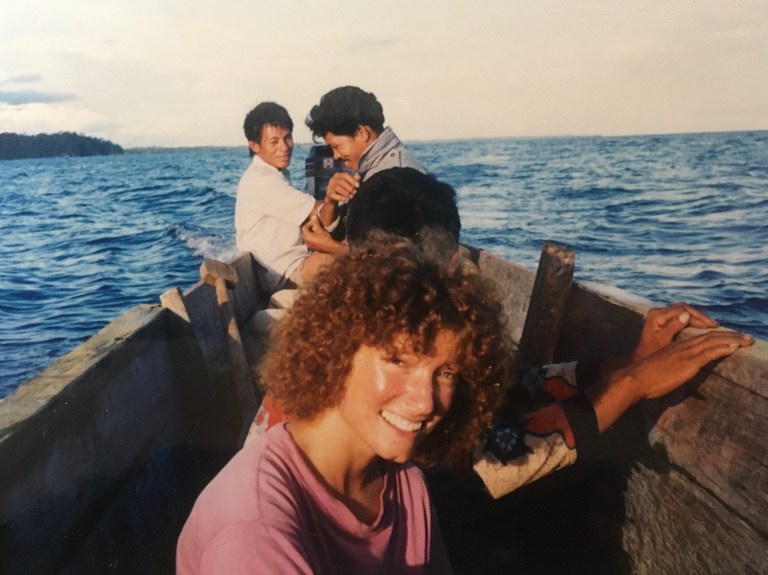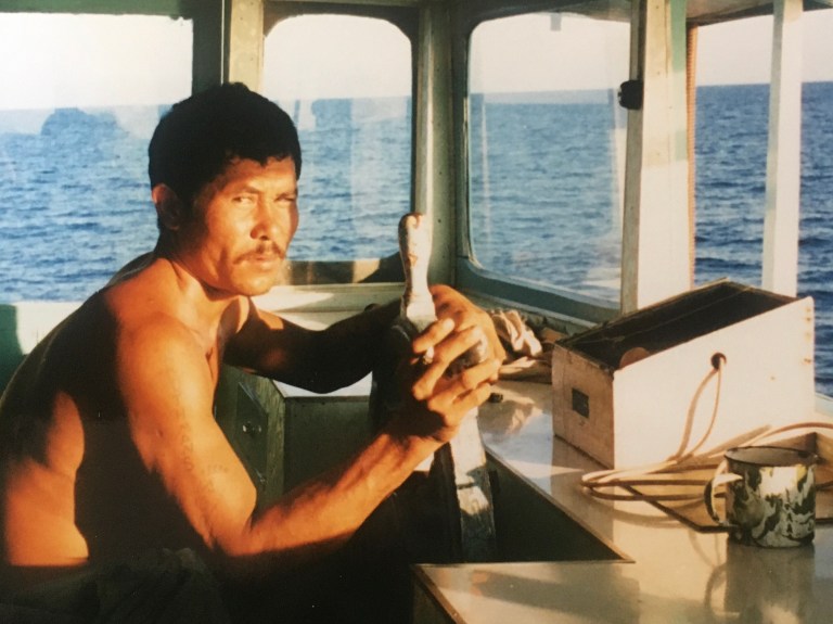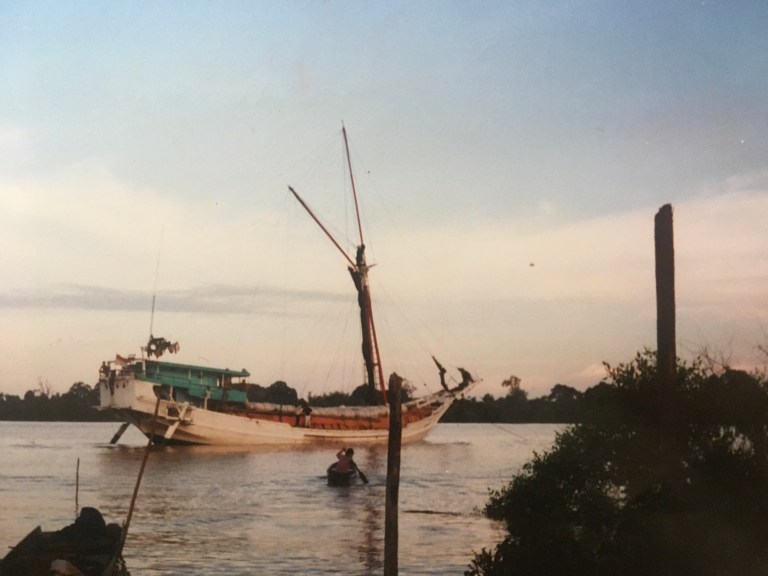 From letters home ” there was no distinguishing among the crew of the ‘Kumana’, the captain dressed the same as the cook. We went up onto the bridge where a man wearing a stripy shirt and shorts was steering the boat with a massive wooden spoked wheel. Michael Jackson was playing full blast on the stereo system. This was as far as mod cons went on this boat. They had a compass, and the cook showed us a rather torn photocopy of a chart with a line on it from Surabaya to Banjarmasin.”