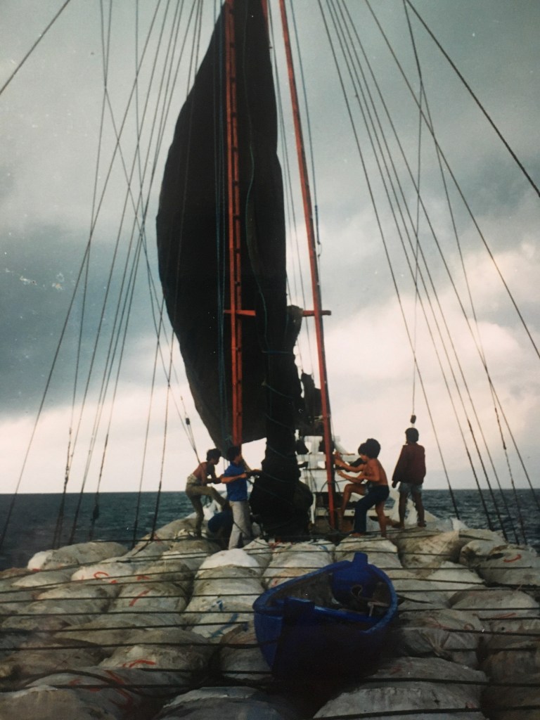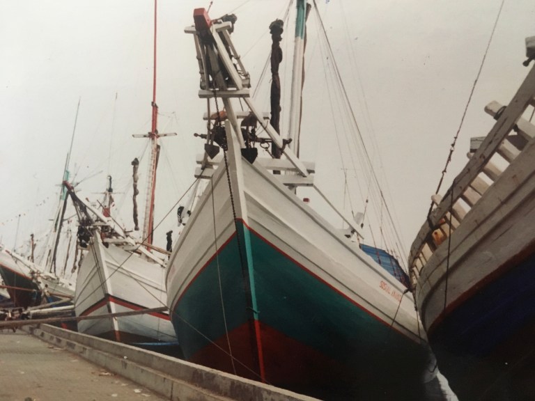 “The next morning we pulled in the anchor, a ten man job, (no winch just muscle, 10 men in a row along the anchor warp), sails were unfurled and and hauled up. The wind filled the heavy brown canvas as we set sail for Surabaya across the Java sea.