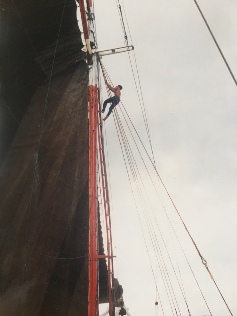 The weather was now much worse, driving rain most of the day and the wind blew strongly filling the sails well. Occasionally the Captain would come to life and there would be a mad rush of the crew as sails were lowered when small squalls approached. Crew confidently climbed the mast to bring in the topsail”.