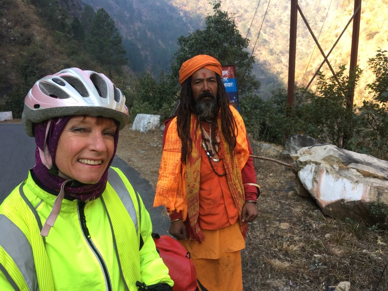 Holy men pilgrims, with rough beards and matted wild hair, wearing orange robes, and carrying a small stainless steel pot for alms, and a knarled stick, make the journey following the Pindar, all the way to the glacier. In 2006 we trekked this same route with Becky and Katy when they were nine and seven years old. This Himalayan trek is on our website. People give the holy men food on the way and a lovely smiley holy man we met, and had a few exchanges with, was very happy with some biscuits. He was a very calm, and content man.