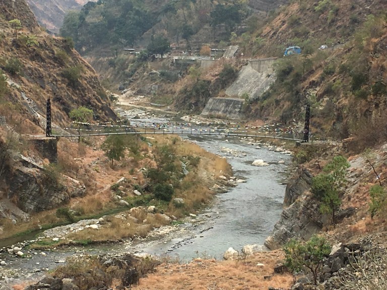 After a few kilometres on the busy road that goes to Lhasa we turned off onto a superb quiet road, built by the Japanese which climbed up over the mountains to the Sun Kosi river valley. We were back in the immense landscape of the Himalayas, fast turbulent rivers, the road clinging to the mountainside as it wound its way through the relief. There were narrow suspension bridges leading to the other side of the valley.