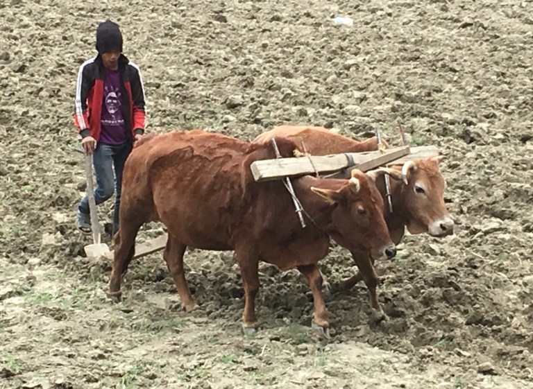 Ox ploughs were working on the terraces of the valley floor. A young lad working hard to keep the beast carving one furrow at a time, up and down the level terrace.