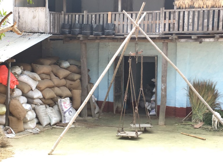 A man asks us ” have you been sent by the government, no” we reply, “we are tourists”, with much look of amazement from the crowd that had gathered. Women made dung patties and dried them in stacks to fuel their stoves. We passed large simple scales on the outside of villages where heavy jute sacks of unthreshed rice were being weighed before they were sold.