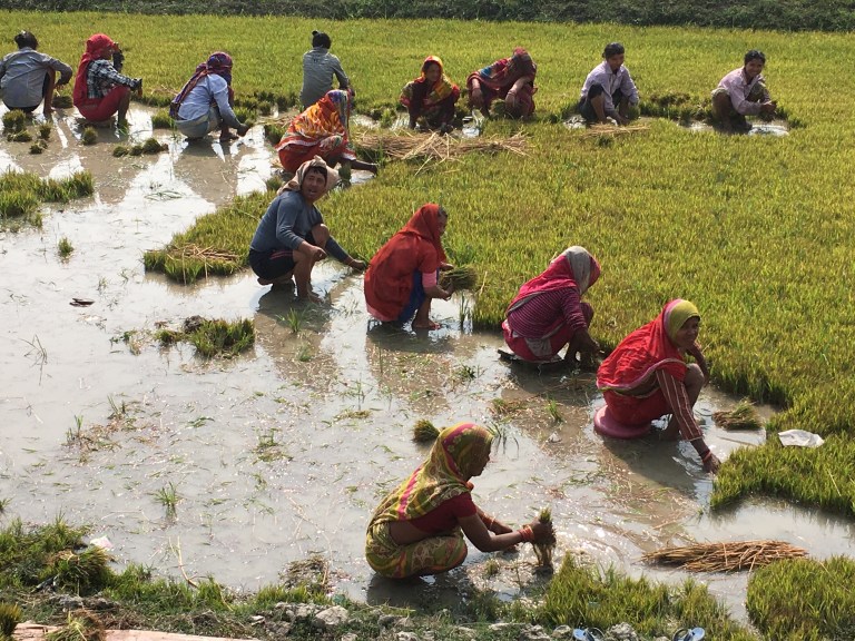 We stopped to chat with some brightly dressed ladies who were digging up rice seedlings to be planted in the rice paddies. Vibrant green plants in the flooded land, contrasting with the reds and oranges of the women’s clothing.