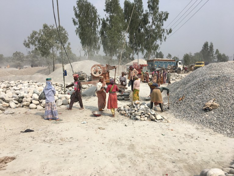 The road from the border lead through mile after mile of rock being crushed, ladies working like ants moving stone to the crusher and reloading the lorries with the crushed aggregate that then headed south towards Dhaka for construction. The air was filled with dust, and the noise of the crushers, running non stop, was deafening. It was hard labour with material being carried in large dishes on people’s heads, lorries unloaded and loaded by hand, and crushers filled.