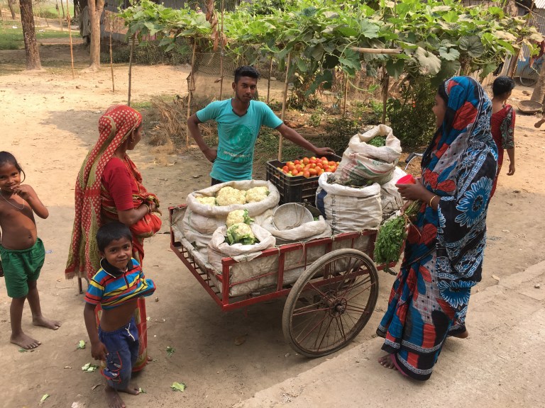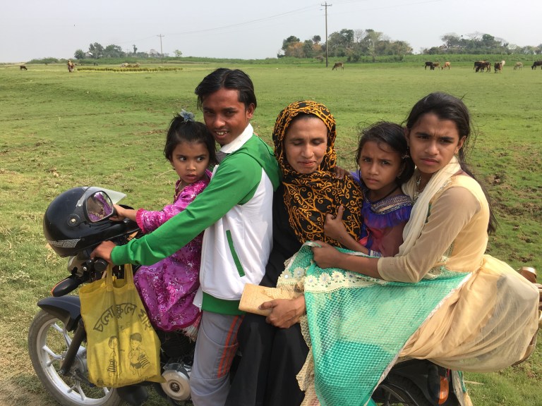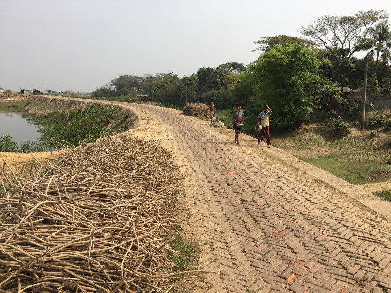 The next day we needed to cross a large wetland area. It’s a very beautiful part of Bangladesh, and what we really remember from the 2011 trip. Small strips of land surrounded by water or rice fields, containing paths and villages, with palm trees and vibrant tropical vegetation overhanging the ditches.