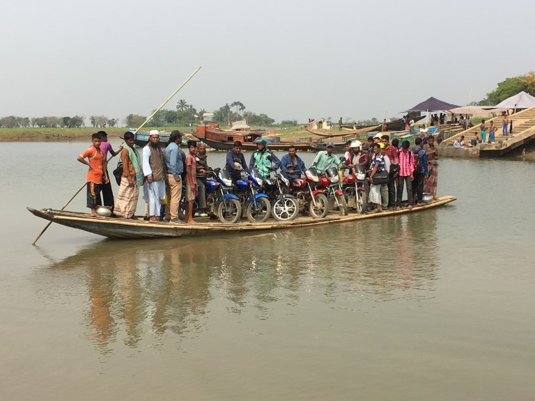 We loaded the tandem onto the boat and lay it down on the split bamboo foredeck. Soon the diesel motor was fired up and we were picking our way through the chars across the Brahmaputra. Some were new islands and some were established. We could see sections of crops collapsing into the water and people’s hard work and food being taken by the flow of the river. Similar boats to ours were carrying passengers and live stock to the islands and others were fishing. We passed one char after another, sometimes slowing right down to find the route through the shallows, and we thought how vulnerable the char inhabitants must feel during the monsoon floods.