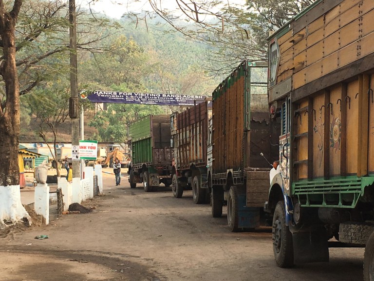 Early the next morning we headed to the border to cross back into India. Passing a line of colourful Indian trucks that had deposited their loads of coal, we cycled up to the frontier.