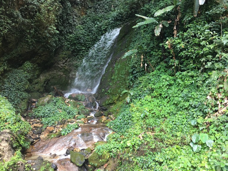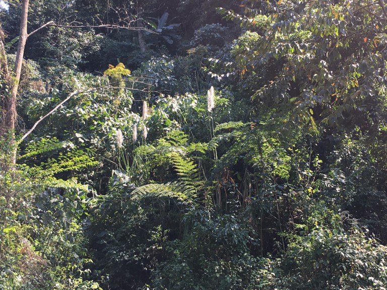 We descended right down to the river and crossed it on a rickety suspension bridge. We climbed the other side of the valley, snaking our way through pristine jungle, rarely seeing another person. This is a truly beautiful place, virgin forest with really tall straight trees, growing to great heights on the mountain side to compete for light. There were huge, broad flat leafed palms with arching branches, creepers hanging over rock faces with water dripping through them, tree ferns growing boldly above other vegetation, waterfalls and cascading streams and rivers tumbling over large boulders beneath the wide green luxuriant forest foliage. I had never seen anything like this place, a spectacle of green with so many big shapes and textures of plant life. Magical colourful butterflies darted about.