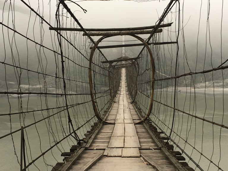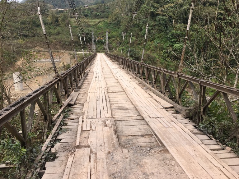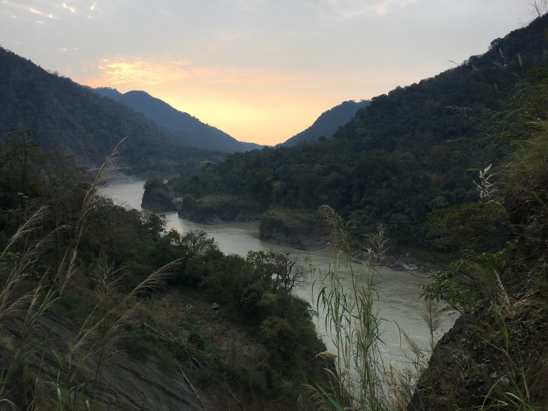 We woke at 4.00am to a howling wind. The thatched palm roof was shaking with the gusts. At first light we were on our way, heading to the eastern Himalayas. We were fighting against the wind roaring down the valley from the mountains as we crossed the bridge.