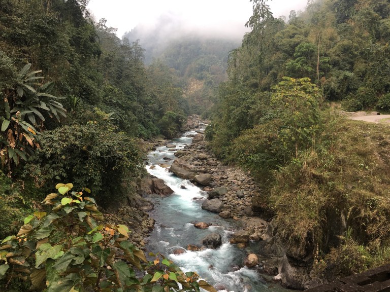 Soon we were climbing through jungle with the turbulent turquoise river below. The noise of the water pouring over the rocks with vigour echoed around the valley. The mountains weren’t as harsh as in the western Himalayas, they were tamer, tropical and lush. The woolly green canopy of the forest followed the shape of the mountains. The place was quiet and empty. We were alone. Villages were far apart and when we came upon them it was a chance to get food and fruit, which was very much appreciated.