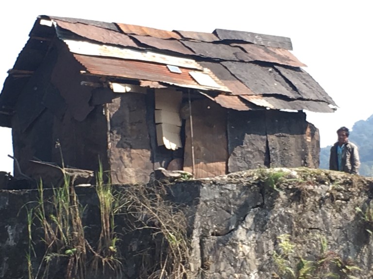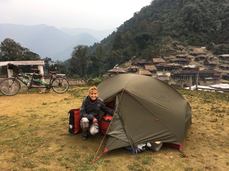 We just got the tent up with lots of help from villagers before a storm came in with hail and thunder. We ate noodles and sardines huddled in our tent as the storm blew over. The village straddled the ridge and low stilted bamboo and timber thatched houses spread along it.