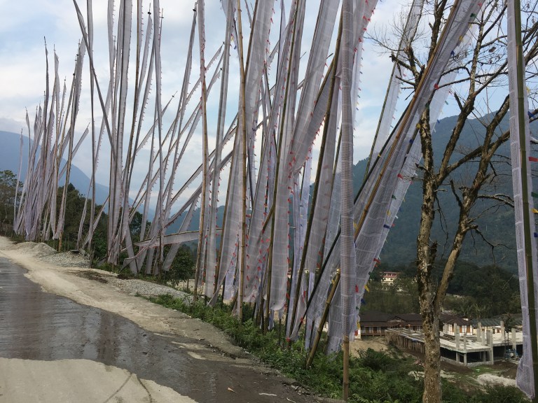 The last rocky climb brought us over the hill to views of Tuting. White flags, with inscriptions, on long bamboo poles fluttered in the breeze. A kind of dream catcher greets us at the beginning of the town. Coloured flags were strung above buildings. Chinese crockery was on sale in the shops. Buddhists and Tibetans are here and we had entered a new land. The Anamist Adis people also live here proudly flying their white and red flags above their houses in large numbers. We find a lodge, and the other guest staying are a group of palmists from Mumbai.