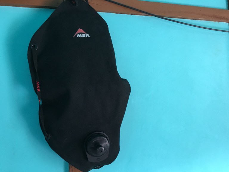 MSR 10 litre water bladder. We used this just for wild camping when you are relying on a nearby river and need plenty of water for cooking and washing up. It’s great for the nights stop and then folds up small when not in use. Also handy if there are long sections of no water to increase the bikes water carrying capacity.