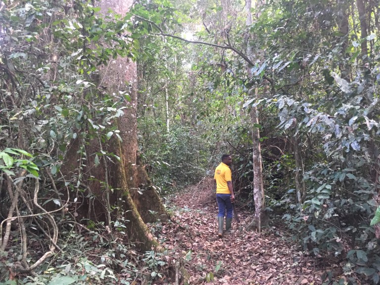 Our first night was spent at a little visited national park. A slightly sorry place, like so many of these projects. Quite a bit invested in concrete buildings at the headquarters, but the forest lacked animals which meant no one visited it. It worked for us as they had a simple guest house and it was on our route. Dominic, the Tourism Officer, not a bad job with a nice house provided and barely ever a tourist, took us on an hour and a half walk in the forest, which was impressive and pristine. Tall mahogany trees stood high above the dense broad leafed jungle. The trail was quite dark with the canopy of trees and foliage providing a lot of shade. Massive insects buzzed about as we cooked our supper over our temperamental petrol cooker. Some moth creatures were like large dead leaves, perfectly camouflaged on the forest floor, and when they took off their large wings flapped slowly as they struggled to gain height.