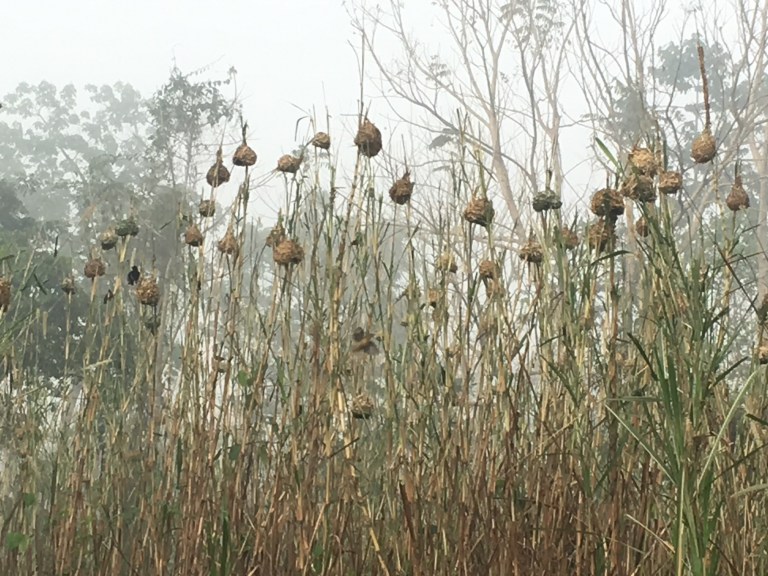 From right back to the beginning of our journey in Senegal we have seen clusters of upside down birds nests, clinging to tall grass or at the end of palm fronds. They blow around in the wind and seem to defy gravity remaining attached to the spindly grass or palm leaves. These are weaver birds and the knot of plant fibres and strands that make up there nest, hang with the entrance at the bottom. We watch the birds, fluttering around the tall grass, darting into the nests or carrying out construction and repair work as they sing away filling the air with tuneful birdsong. We wonder how the inside of these round structures is arranged to cope with an upside down world.