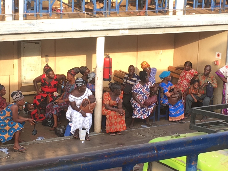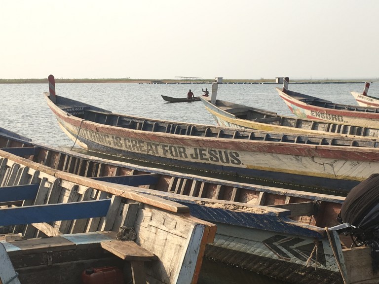 Once we started to drop off the Plateau towards lake Volta the scenery changed dramatically. It was arid, rocky, only supporting small trees, and the ground lacked greenness. There were initially no villages in this harsh landscape, that we guessed was in the rain shadow of the jungle clad escarpment we had climbed up. Once at the Afram river arm of lake Volta the villages returned and it was great to see the familiar timber long boats with religious captions painted on, that were pulled up on the foreshore. At the port there was a lot of excitement, lovely jovial people, and comings and goings of boats from the lake, made for a busy scene that we remembered all so well from our previous trip with the girls.