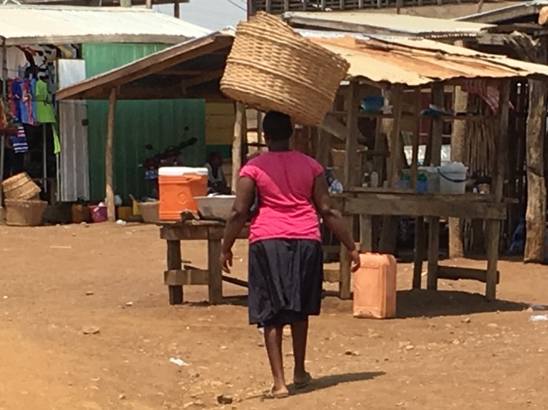 The orange mud landscape passed us by, dotted with occasional villages that blended into the landscape, being built from the same mud, under grass roofs. People sat about the communal areas, waved and called out. Eventually we arrive at the ferry that would take us over the larger eastern arm of lake Volta to the bustling market town of Kpandu. A steep, very hot climb up from the foreshore brought us into the town. Market stalls with the all too familiar neat piles of tomatoes, onions, garden eggs, and okra, laid out to represent certain denominations of money, made up the stalls. There were large heaps of pineapples, plantains, and papaya. It was a welcoming site and we always love a market with all the life going on.