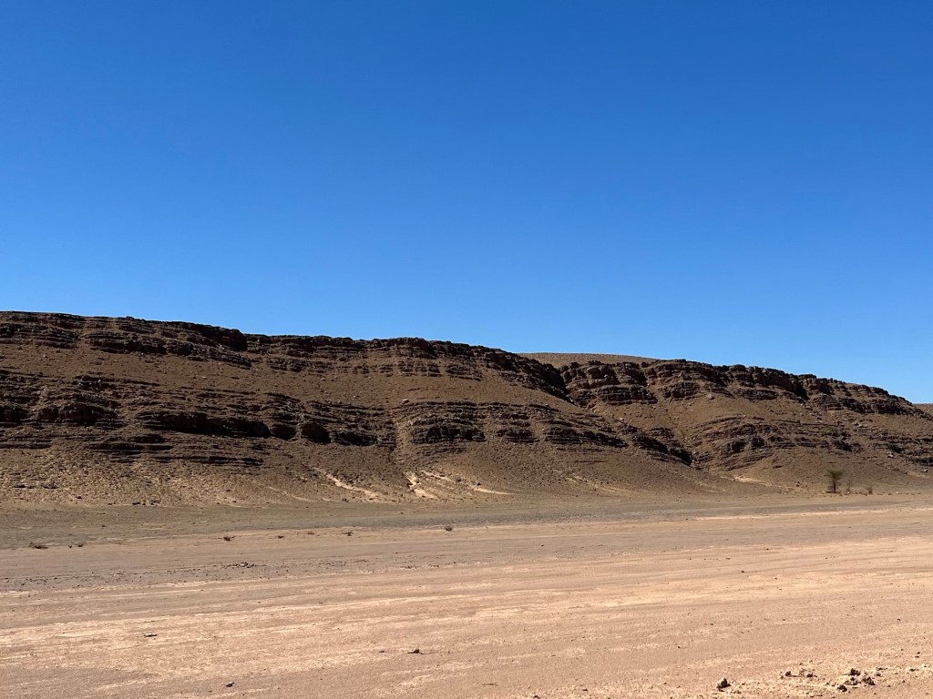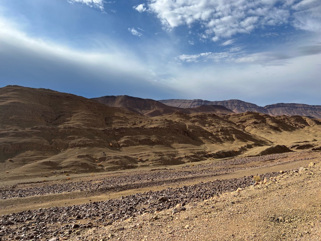 After the pockets of sand dunes near Zagora that attract the desert tourism the desert returned to large expanses of stoney ground backed by long rocky escarpment ridges that were sometimes in the distance as a backdrop and at times came close to the road which was more dramatic. The oasis were spread out here, not in a string along a dry river like the ones close to the Atlas, but isolated points where there was water.