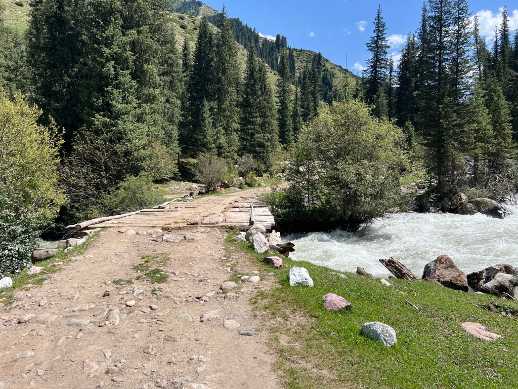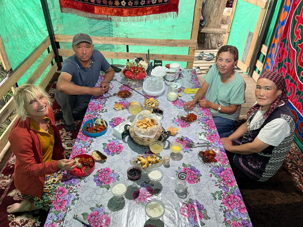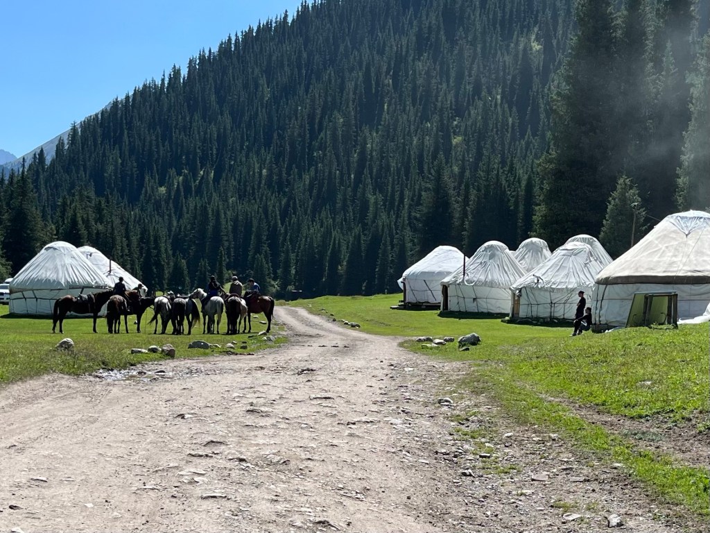 A little way down the valley we stayed in a Yurt camp. It was the weekend and many locals come out to these valleys to stay in the yurts and enjoy the mountains. It was a different world to higher up the valley but fun to see everyone enjoying themselves. There was horse riding, archery, shooting and playing on makeshift swings. A charming group of Russian families from Moscow were staying at our Yurt camp as part of a summer holiday tour to Kyrgyzstan. They were so nice and invited us to join them. We had a wonderful time chatting and walking with them to a waterfall.