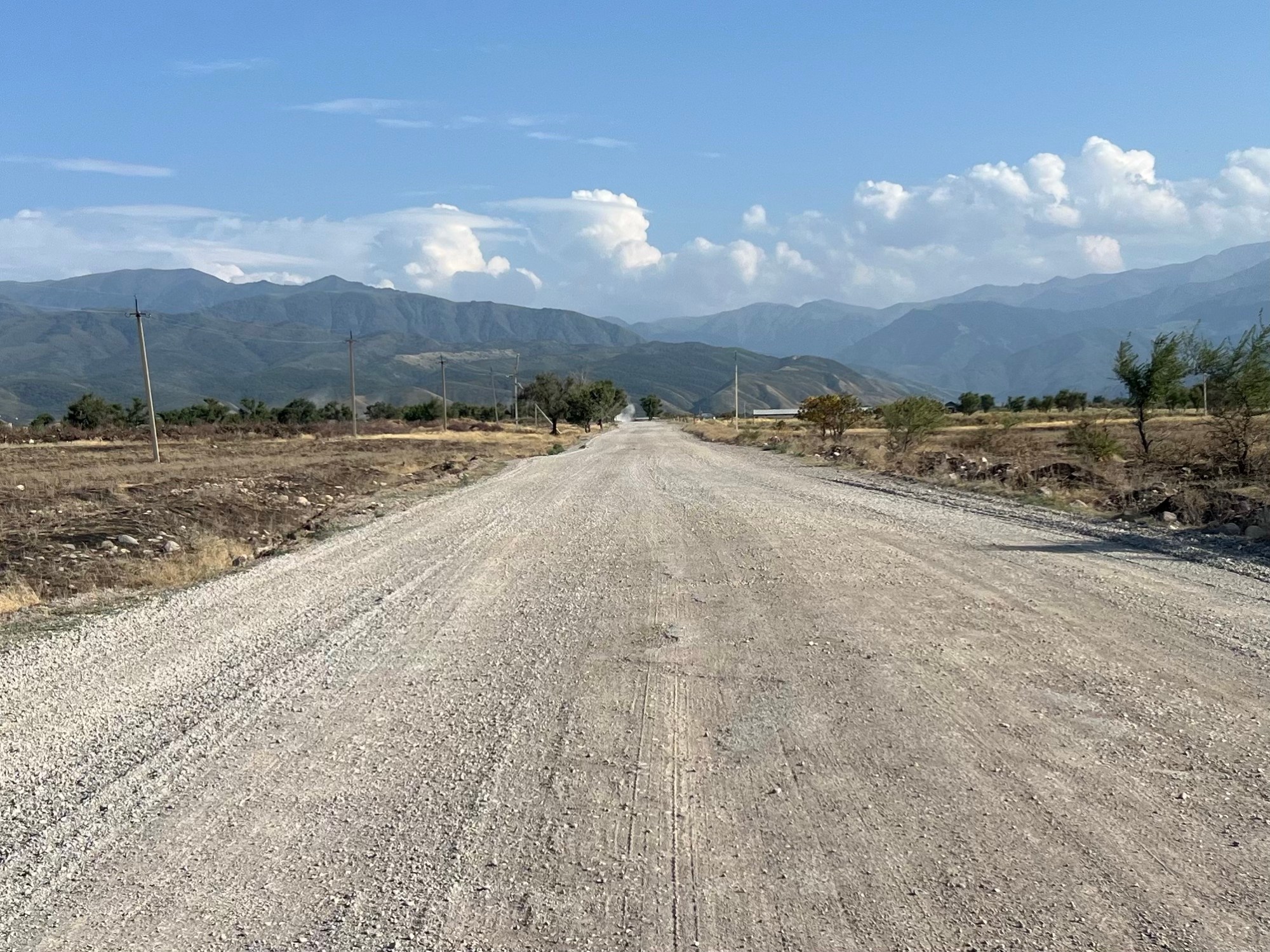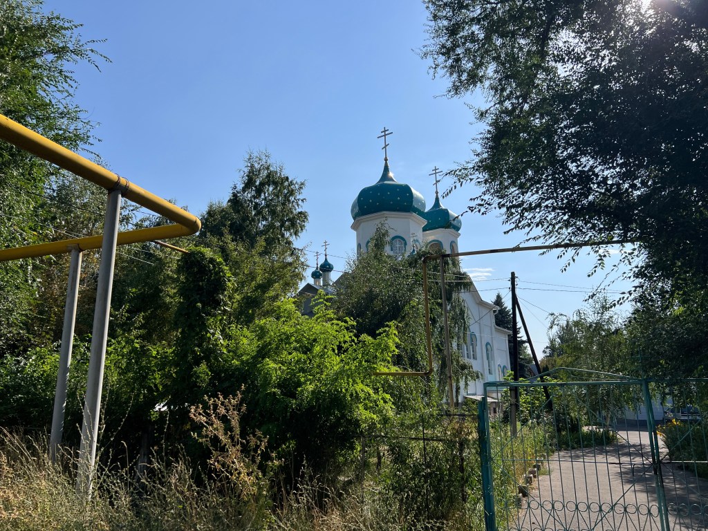 Today was all about finding our feet and we spent a second night in Slava’s garden. We ventured out to the next town stopping at the market, a place for lunch,  and some shops to take on supplies. We covered sixty kilometres and enjoyed the lovely encounters and appreciated learning bits and pieces of Kazak life.  The bread lady in the market shared slices of melon with us and chatted. A shop where we stopped for a drink brought us wild raspberries that are grown up in the mountains at 1500 metres and huge strawberries while we chatted with a young trainee teacher. We were given Kurt, a national food, made from sour curd. It sucks your mouth dry of any moisture, not an altogether nice experience. We drank tea served from large jugs with our lunch. The peoples faces are warm and kindly.  A mixture of slightly oriental looking and harsher lighter skinned faces perhaps from Russia or the Caucuses. The ancestry is ethnically diverse. People have arrived from the east and west, plus there was a lot of forced movement of people to Kazakhstan during Stalins time. There are mosques and churches, both are ornate and domed. This contrasts to the harsh nondescript buildings around and the overhead yellow gas pipes  that dominate the skyline.