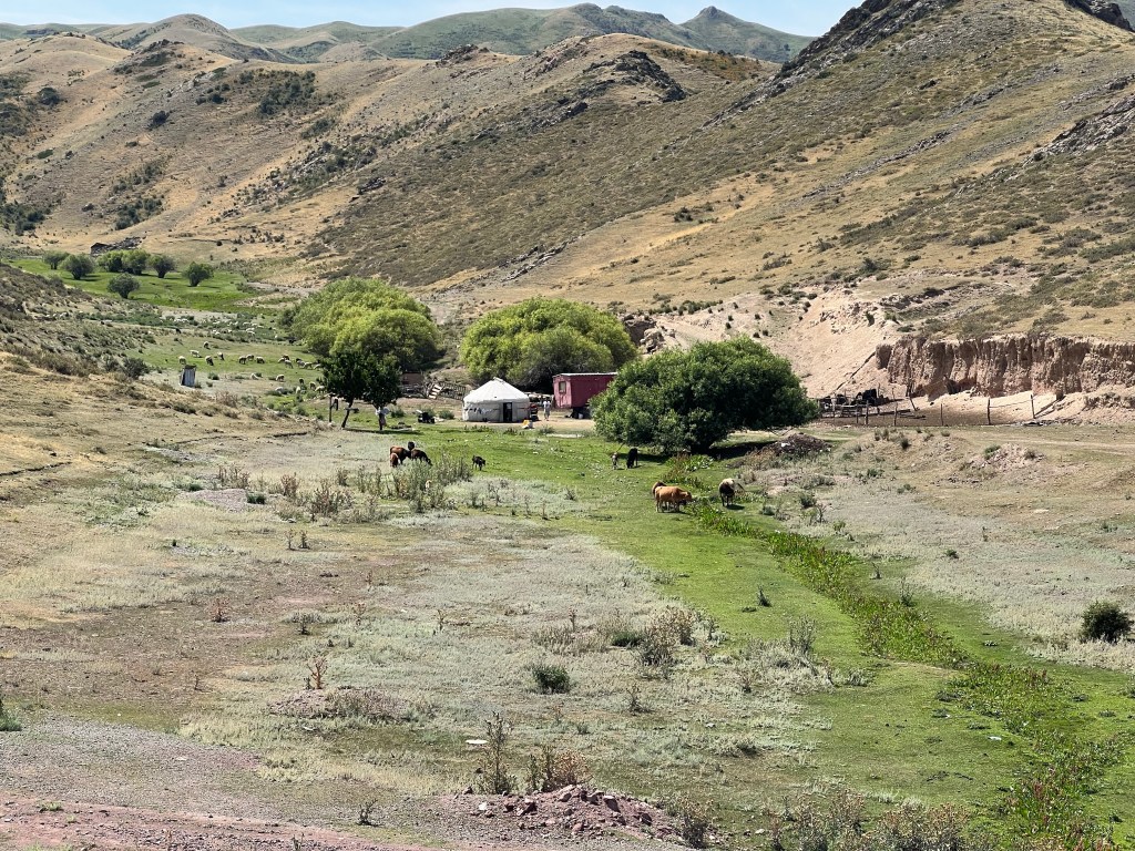 We have been climbing since leaving the canal and the scenery has changed. Arid impressive landforms are interspersed with greener valleys that support the odd farmstead. A yurt, some cows and a flock of sheep grazing on the parched grass of the steppe. Sometimes a few ramshackle corrugated iron buildings complete the little farms. Mountains separate the plains and the scene becomes more rugged and empty. Graveyards stand in quiet locations a little way from settlements. The view across this land reminds us of the start of the Sahara in southern Morocco and parts of Namibia, the colours of the parched grass set against the sandy coloured rocky soil and the rugged mountains in the distance, their purple hues silhouetted against the sky.