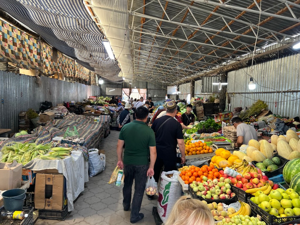It’s been a long day and we are exhausted. We are plunged into a very different world from Kyrgyzstan. The mountains aren’t so green, construction on a scale you haven’t seen before, vast areas of Industry, a lone yurt on an island of carved up landscape, fenced and gated villages with rows of identical houses in grid like straight lines for nomadic people, and eventually wide dual carriageway highways as we approach Kashgar. We arrive downtown.  Chinese and Uyghur writing everywhere,  not a sign in English, it felt very foreign, intimidating and oppressive particularly experiencing the level of control and checks on the way. There were lots of people everywhere, darting about on electric scooters, traffic, brightly coloured commerce, noise, and pungent smells of spice and the air was full of the aroma of exotic food and incense.  A bustling Chinese city on a vast scale. Large neon signs in Chinese characters dominated the street scene, but the enterprise below them was diverse and Asian, a complete array of shops and eating places selling everything from spice, dried fruit, colourful fruit and vegetables, pungent meat cooked on smoky charcoal to all kinds of functional shops like pharmacies, opticians and supermarkets. Interesting all the signage has the Uygur language first!