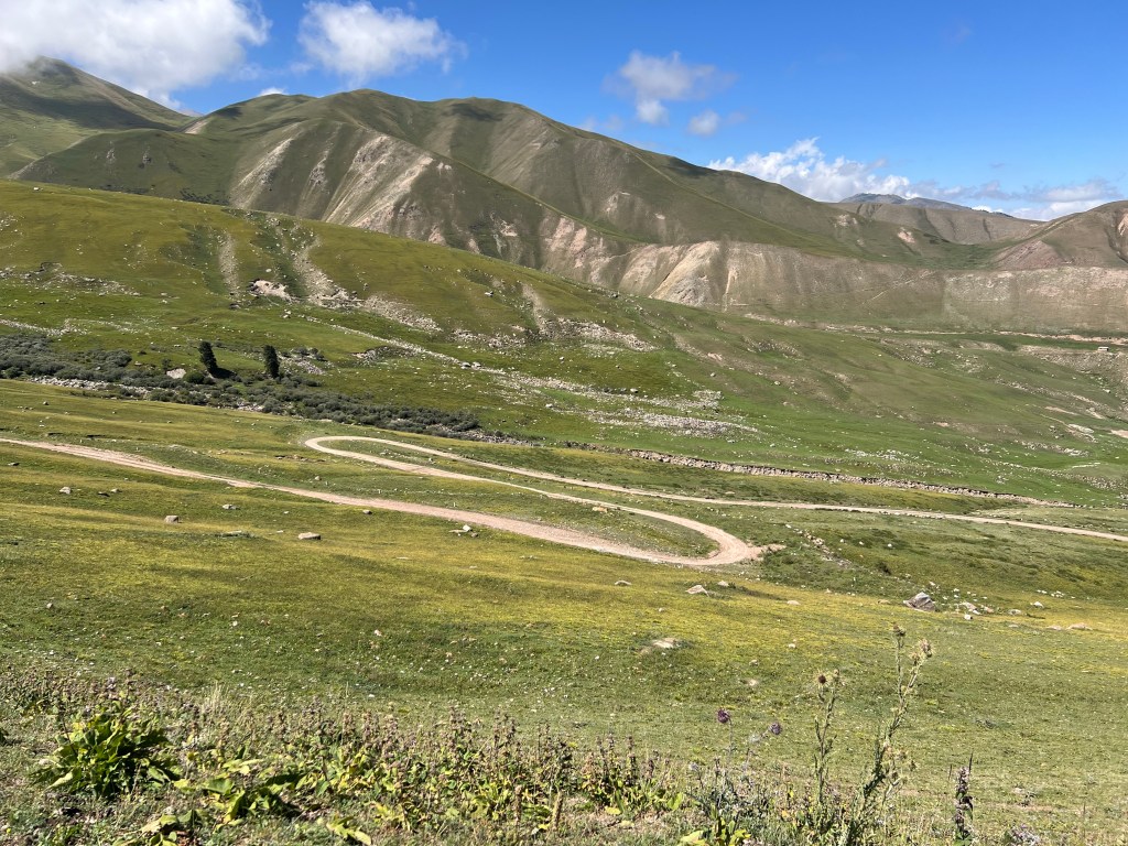 The track left this fertile oasis and started climbing through rolling green mountains on a vast scale. The less verdant short grass that covered the landscape was scattered with rocks and gave way to harsher craggy relief higher up. Snow capped peaks sat against the clear blue sky towering high up in the distance. The weather was perfect, calm and sunny.