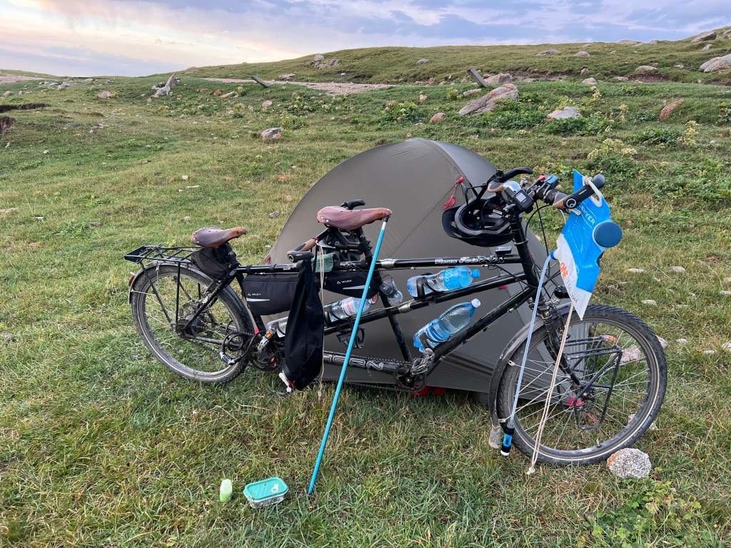 We have now climbed to nearly 2000m elevation and getting close to the Kyrgyzstan border. We wild camp in the mountains by a river about 6 km before the border.