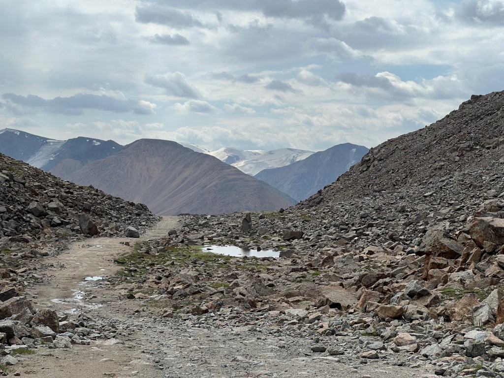 An early start had us back on the rugged route towards the pass. 700m still to climb and soon the rocky olive coloured slopes were replaced with angular hues of grey rock. White ice hung onto the crevices of the northern sides of ridges and peaks. Piles of rock debris formed screes that heaped up against mountain sides.  The route was often unrideable. We pushed the bike for lengthy spells, needing to stop regularly to get our breath back. It was brutal. We meandered our way through the harsh terrain between huge mounds of rock debris. The setting was like an amphitheatre made of surrounding high mountains and ridges with threatening masses of fissured ice hanging onto the sides high up. We were centre stage, tiny, and diminutive, finding our way through this stark remote ominous scape. Eerily the ice groaned and creaked and as the sun got  higher and warmed the glacier, rocks were released and tumbled down the mountain side making an unnerving reverberating sound that echoed around the theatre. There was a turquoise lake set deep in the geology fed by meltwater and surrounded by craggy boulders and scree.