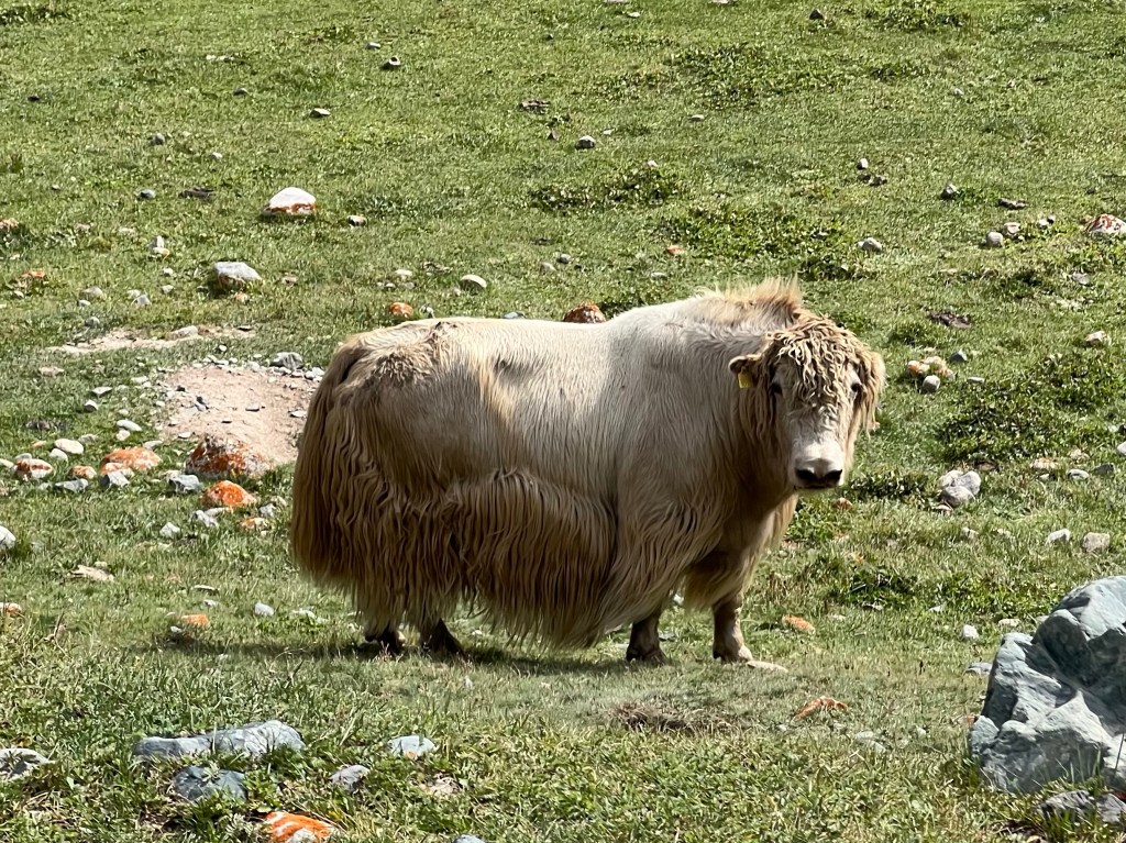 As we came round the next corner feeling shattered, the huge snow covered mountain, ‘The Borris Yeltsin Peak’ was majestically ahead of us, set stark against the rocky lower peaks and all contrasting with the dark green tree lined mountains of the foreground and set off by the vibrant pastures with grazing genteel horses and bulky cows.