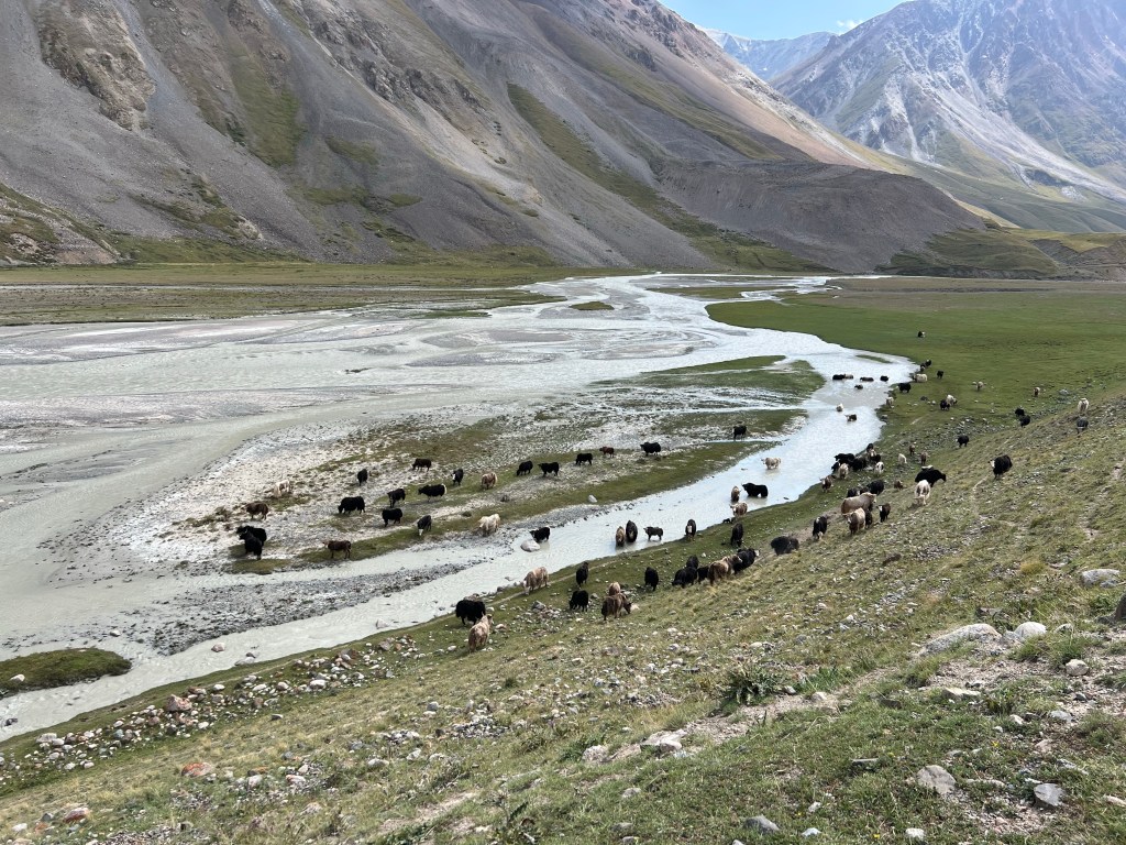 Finally we coasted down hill on the bumpy track. The trail was less steep and we followed the now green again valley systems with the river not far away and accompanied by occasional herds of horses, cows and yaks. Grand horseman herders rode by. Bundled in warm clothing, wearing waistcoats and always with their binoculars in leather cases at their side, they looked the picture of the Kyrgyz nomad herder or perhaps a Mongolian eagle hunter. We wondered whether the treasured binoculars in their worn and battered cases had been handed down through the generations.  They rode their horses so confidently and elegantly, it was as if the horse was joined to them, man and horse in perfect harmony. Pristine white and felt yurts positioned on vantage points overlooking the river and hilly valley contrasted with the green land.