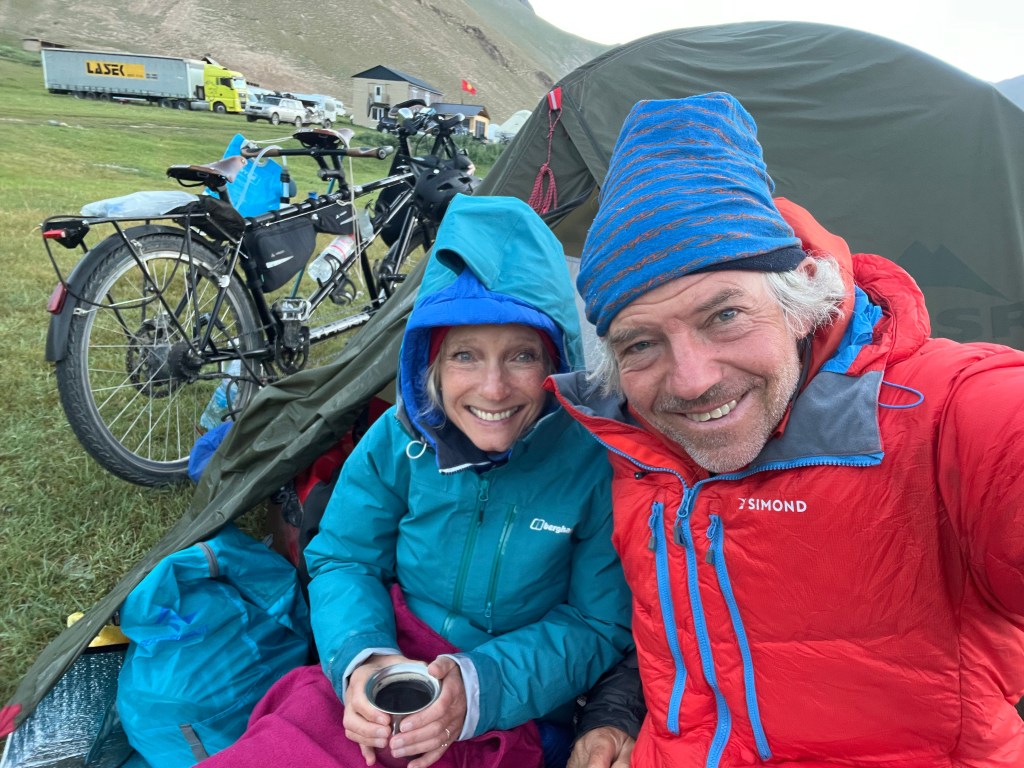 We woke to rain, heavy cloud hung over the Tian Shan, the day before we had been in 35 deg C, sweating our way across the mountains and steppe, now we were cold.  We cooked breakfast, noodles, eggs and a tin of sweetcorn,  in full waterproofs and huddled in the tent. It was a slow start and we pushed on to the Kyrgyzstan border. The rain became torrential and the road deteriorated after the frontier. We climbed and climbed rough rocky tracks to the Kizil Kiya pass. Thankfully the rain eased and stopped which was a blessing as we pushed the bike up steep rock strewn hills to the top. The views opened out as the cloud hung onto the higher peaks. Vivid green valleys with herds of exquisite elegant horses roaming the panorama. The occasional simple farmstead, old cans and milk churns upturned on posts around little courtyards, shelter provided by a few rusty old sheets of corrugated iron. Smiles and waves from farmers with rugged wrinkled faces. Sweet children come running out and want to just say hi and shake hands in a very polite way.  The green mountains rounded slightly, by the harsh ice and snow of the winter, form a rolling vista, set against the towering peaks of the Tian Shan.